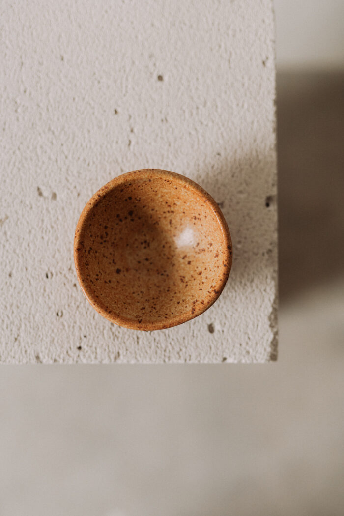 Sosiera dip (tip bol) realizata manual din gresie ceramica bej cu picatele, forma neregulata.